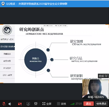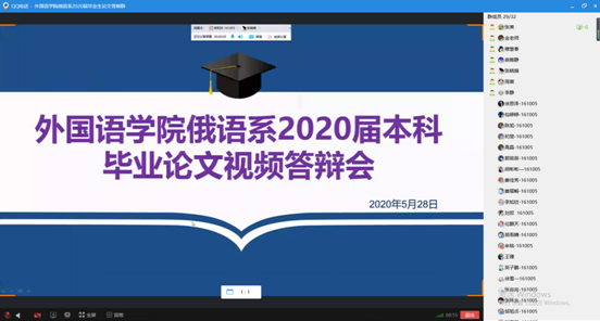 本网讯(通讯员 张美)按照《永利官网2020届本科毕业设计(论文)答辩工作方案》以及yl6776永利集团关于2020届本科毕业论文答辩指导文件的要求,在经过三轮查重检测之后,俄语系制定了审核答辩+视频答辩的具体实施办法。毕业论文答辩工作有条不紊地进行,经过评审推荐,王凯、夏海、牟铭、吴子鹏、姜佳秀、郑玉等6名同学参加了视频答辩。俄语系主任张美主持答辩会,并做开场发言,介绍了答辩委员会成员以及整个答辩流程。俄语系教师全部出席答辩会,学院院长彭又新,副院长周爽参加了答辩会。