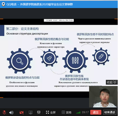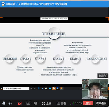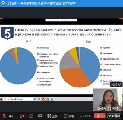 答辩人按要求一一展示自己的PPT并回答答辩评委的论文研究相关问题,6位答辩人以研究问题的深度、俄语语言的表达叙述能力、论文结构的缜密性创新性等完成论文写作,出色地展示了学院2020届俄语系学生综合水平。