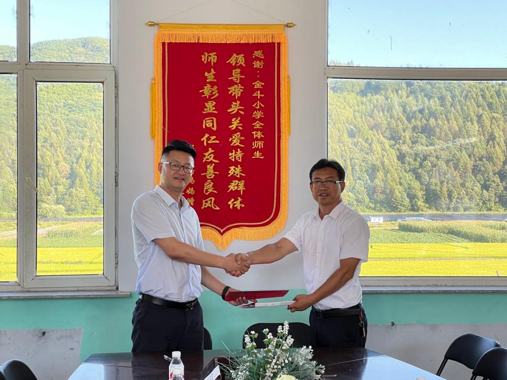 随后,走访团队来到金斗朝鲜族满族乡中心小学,校长李龙介绍了学校的基本情况,王轶和隗英辉校友共同为yl6776永利集团大学生就业创业实习基地揭牌,党委副书记于伟代表学院与金斗小学签订了大学生就业、实习、实践基地合作协议,并就学生实习、学业帮扶等方面进行了深入探讨。