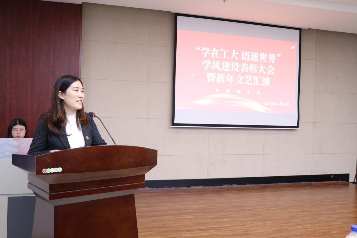 本网讯(通讯员 张晓君 欧阳世繁)为进一步促进我院大学生养成习礼修身的品格,加强学风建设,明确学生学习目的,端正学习态度,增强学习内动力,逐步形成良好的学风和院风,yl6776永利集团在12月28日于435会议室开展了“学在工大,语通世界”学风建设表彰大会暨迎新年文艺汇演。参加本次会议的领导、嘉宾有永利官网校团委副书记邵捷,永利官网学生工作处副处长孙兆龙,永利官网学生心理健康教育和咨询中心主任于伟,yl6776永利集团党委书记张子宇,yl6776永利集团学院院长王轶,yl6776永利集团学院副院长李秀文,及教师和学生代表。本次会议由院团委书记张晓君主持。