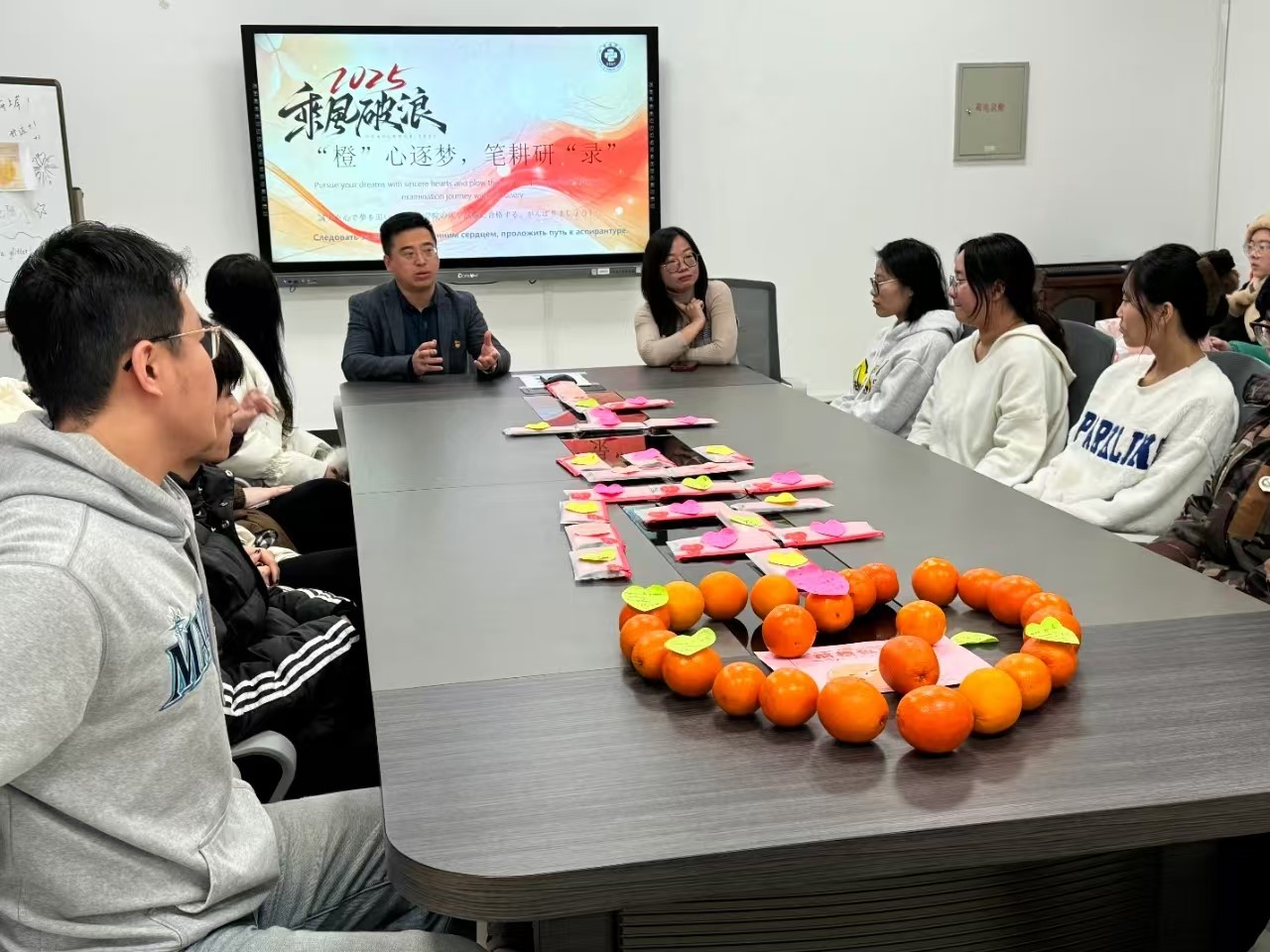 本网讯(通讯员 秦艳萌)为鼓励考研学生考试信心,缓解考研学生备考压力,我院于12月12日上午在433会议室举办“橙”心逐梦、笔耕研“录”活动。学院党委副书记刘凤利,党委专职组织员、毕业班辅导员谭密以及在校备考的考研学生参加了此次活动。