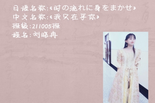 选曲感想:近来,由于新冠疫情形势严峻,封寝管理期间,生活有些枯燥,心情难免烦闷。学院值此之际举办日语歌唱大赛,给我们无聊的寝室生活增添了许多乐趣。我个人非常喜欢日本昭和时期的著名女歌手中森明菜,平时也很爱听她的歌,其中《難破船》是我最喜欢且拿手的歌,所以选了这首歌参加比赛。