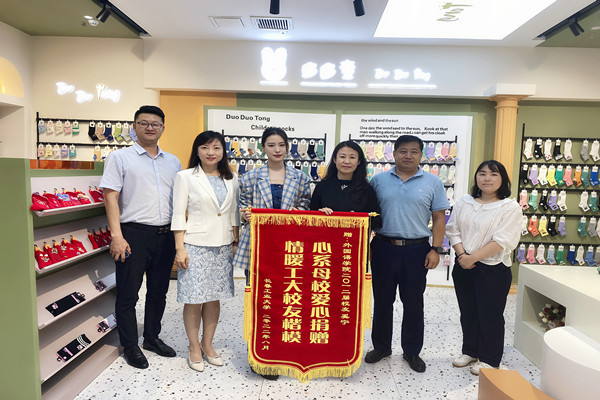 李东玲代表学校,向奚宁校友赠送了70周年校庆纪念品,颁发了锦旗和捐赠证书。yl6776永利集团党委书记李文章和奚宁校友共同为yl6776永利集团大学生就业创业实习基地揭牌,院长王轶代表学院与多多童袜业有限公司签订了校企合作协议。yl6776永利集团党委副书记于伟主持走访活动。